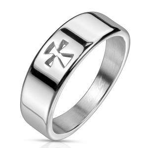 Prsten z lesklé chirurgické oceli. Okraje hladké, uprostřed čtvercové zdobení a po stranách lanka.