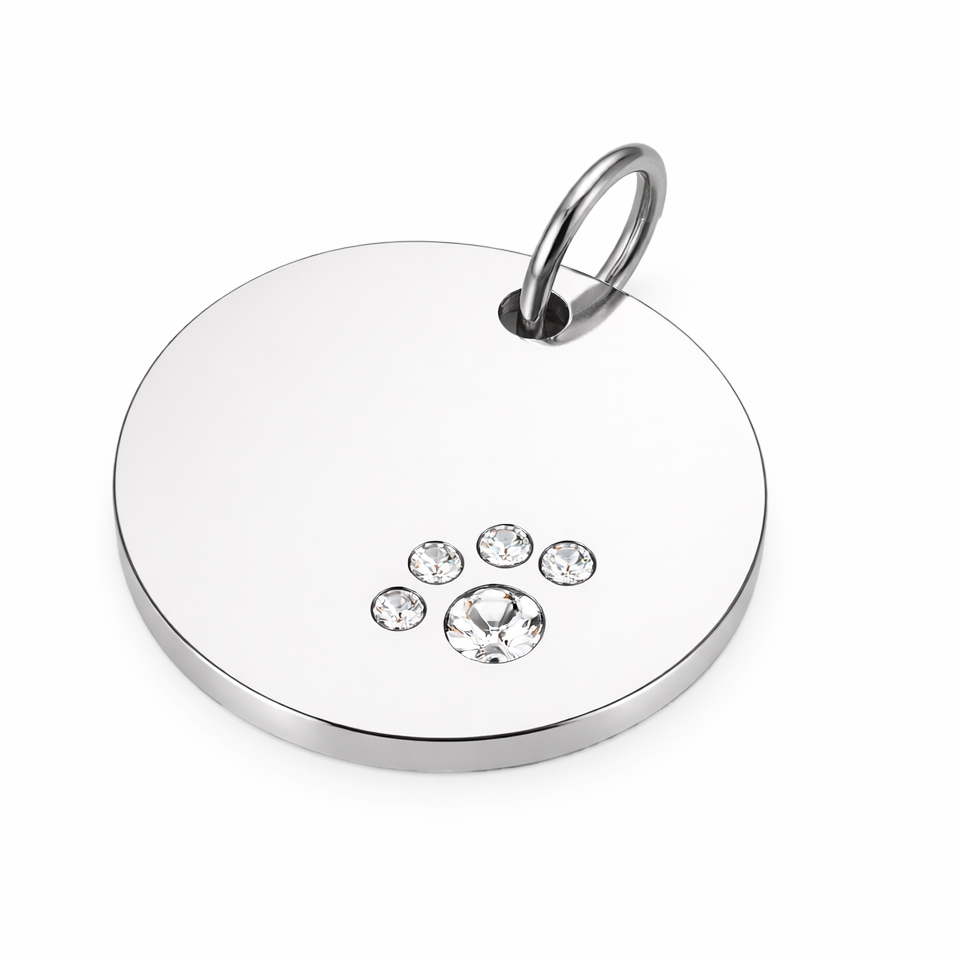 Luxusní přívěsek na obojek z chirurgické oceli - kolečko zdobené tlapkou s čirými zirkony.