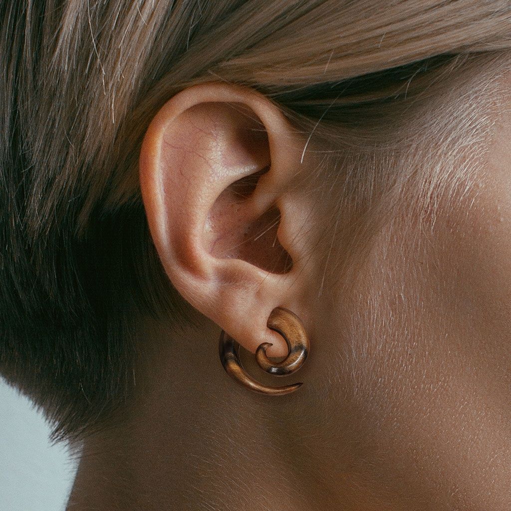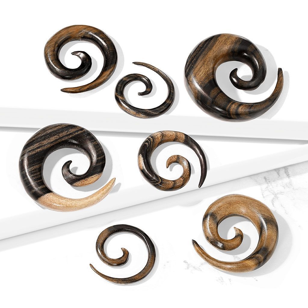 Dřevěný roztahovák - spirála do ucha z ebenového dřeva. Každý kus má jinou originální kresbu dřeva.