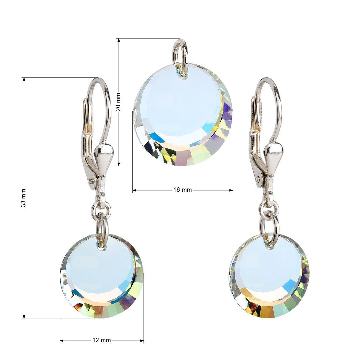 Souprava 39017.2 obsahuje visací náušnice a přívěsek ve stejném designu. Šperky jsou vyrobeny ze stříbra ryzosti 925/1000, které prošlo povrchovou úpravou rhodiem. Rhodium chrání šperk proti zčernání, zežloutnutí i poškrábání. Přívěšek i náušnice jsou zdobeny bílými Swarovski krystaly ve tvaru kulatého penízku. Krystaly disponují AB efektem, díky němuž na světle hází nádherné odlesky nejrůznějších barev. Náušnice mají zapínání na klapku. Jelikož šperky neobsahuji žádný přídavek niklu, mohou je bez obav nosit i alergici.