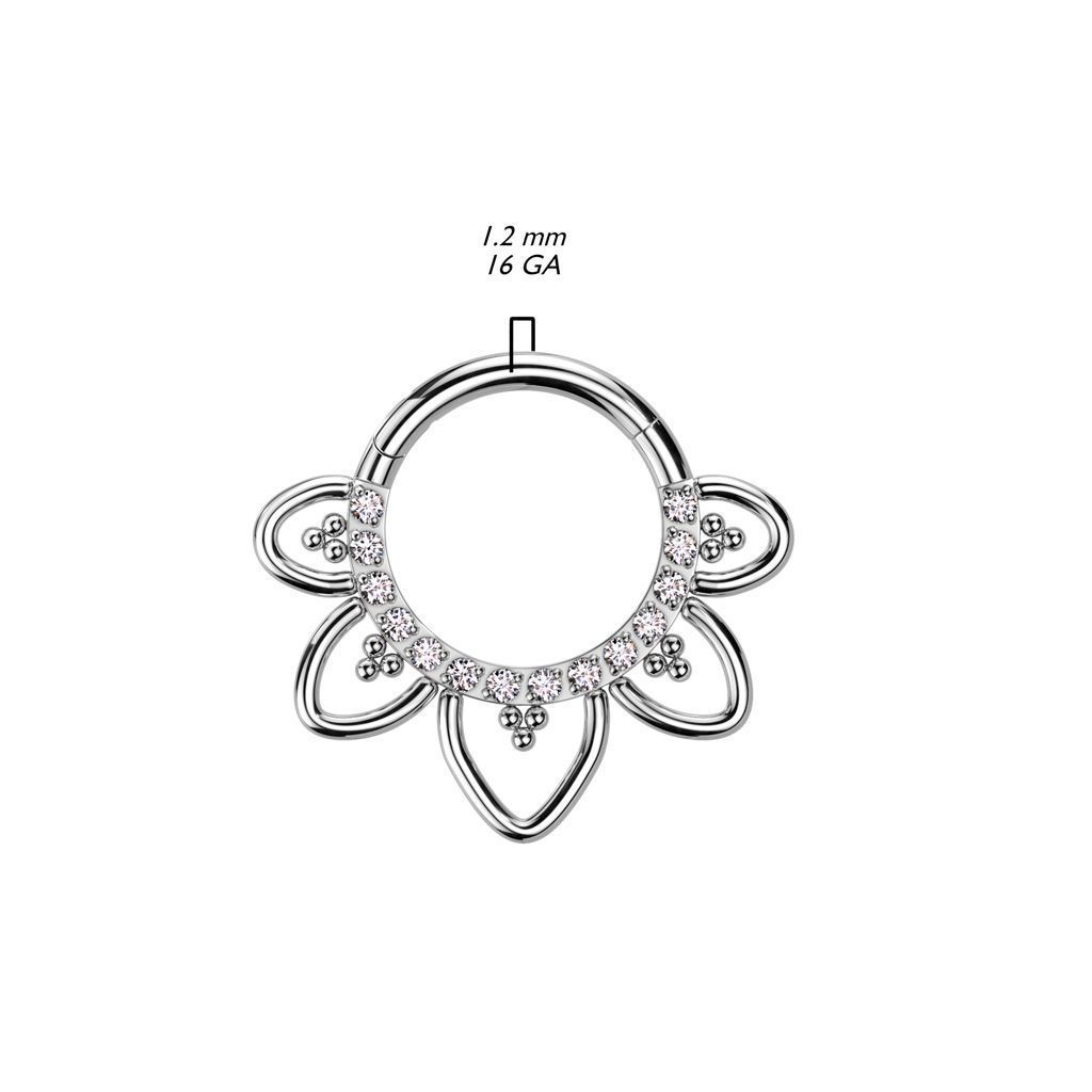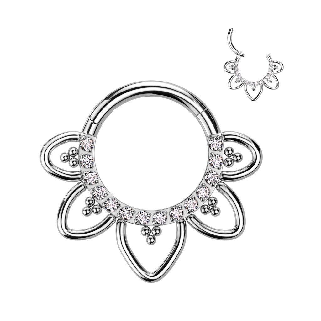 Ozdobný titanový segment kruh s praktickým zapínáním na pantík. Piercing vhodný do ucha nebo nosu (septum). Piercing je zdobený čirými zirkony.