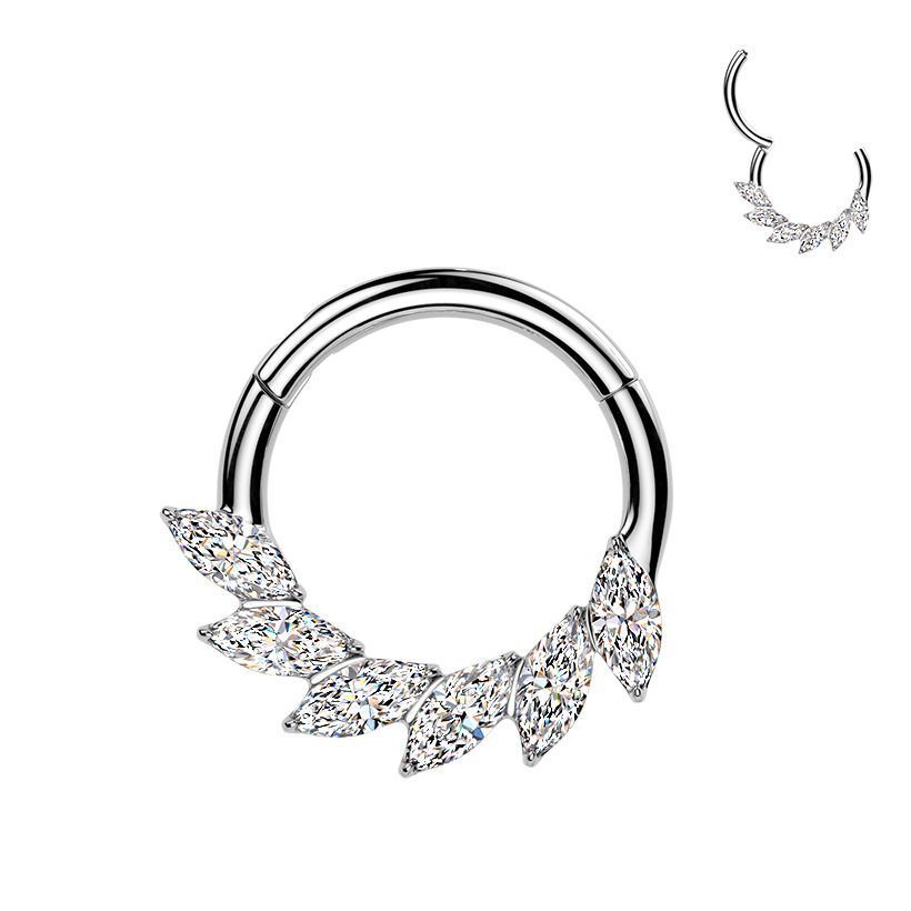 Titanový piercing - otevírací segment kruh se zirkony. Piercing má otevírání na praktický pantík.