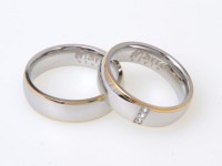 Uprostřed prstenů je zlatá proužka - zlaceno 18K zlatem. V dámském prstenu jsou navíc zasazeny 3 zirkony čiré barvy.