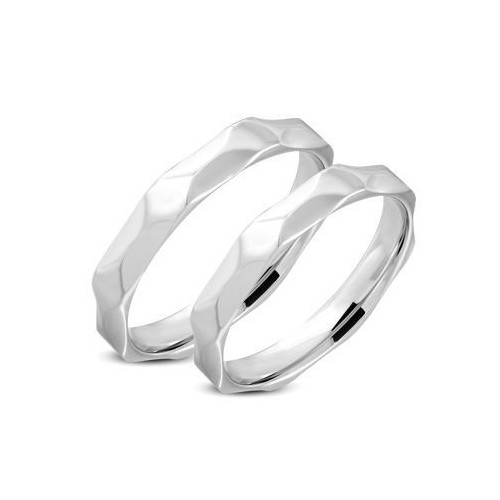 Snubní prsteny z lesklé chirurgické oceli. Prsteny mají po bocích jemné ozdobné \"prohlubně\".