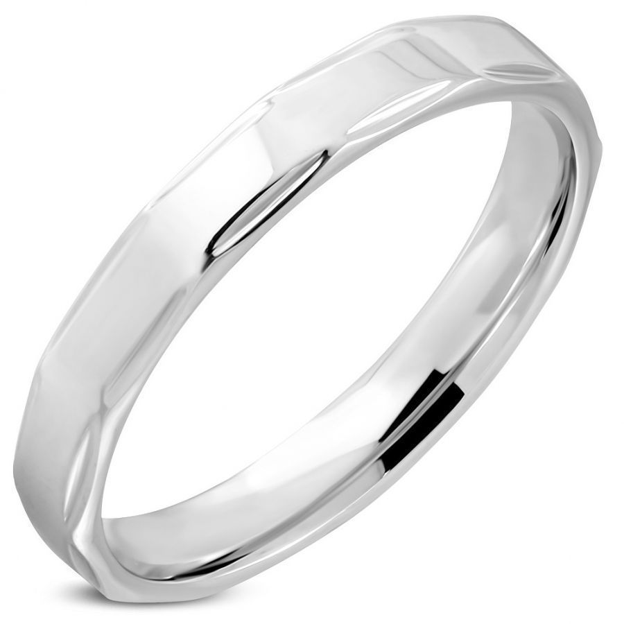Snubní prsteny z lesklé chirurgické oceli. Prsteny mají po bocích jemné ozdobné \"prohlubně\".
