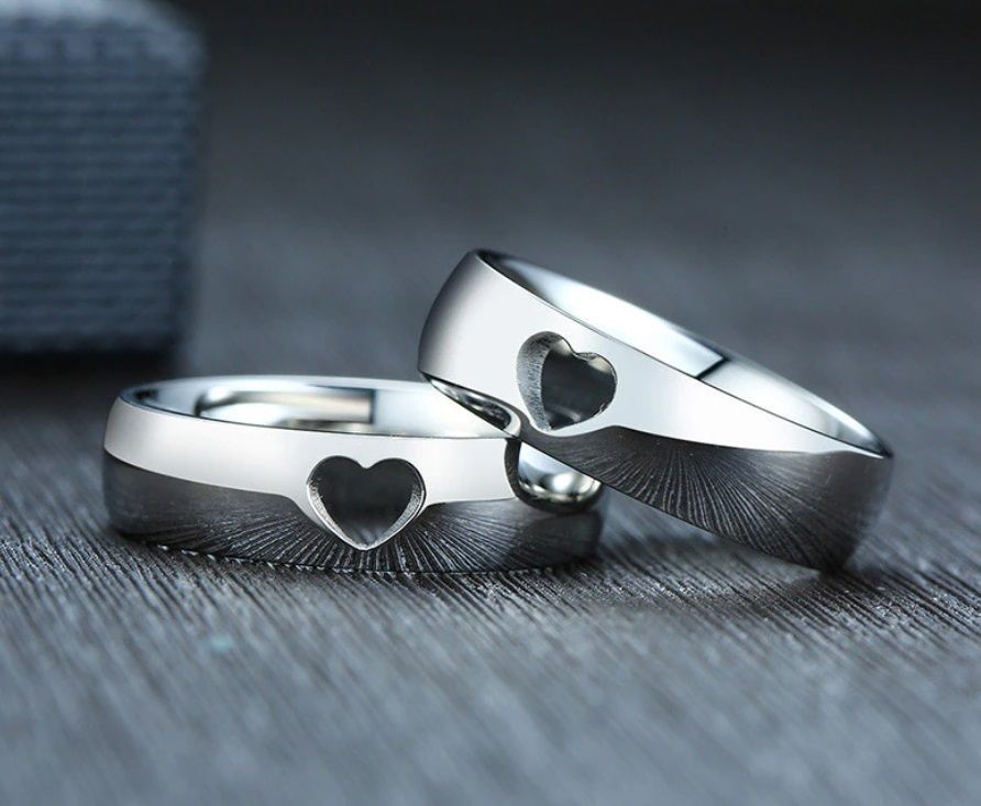 Snubní prsteny z lesklé chirurgické oceli. Každý prstýnek má v sobě vyříznuté srdíčko.