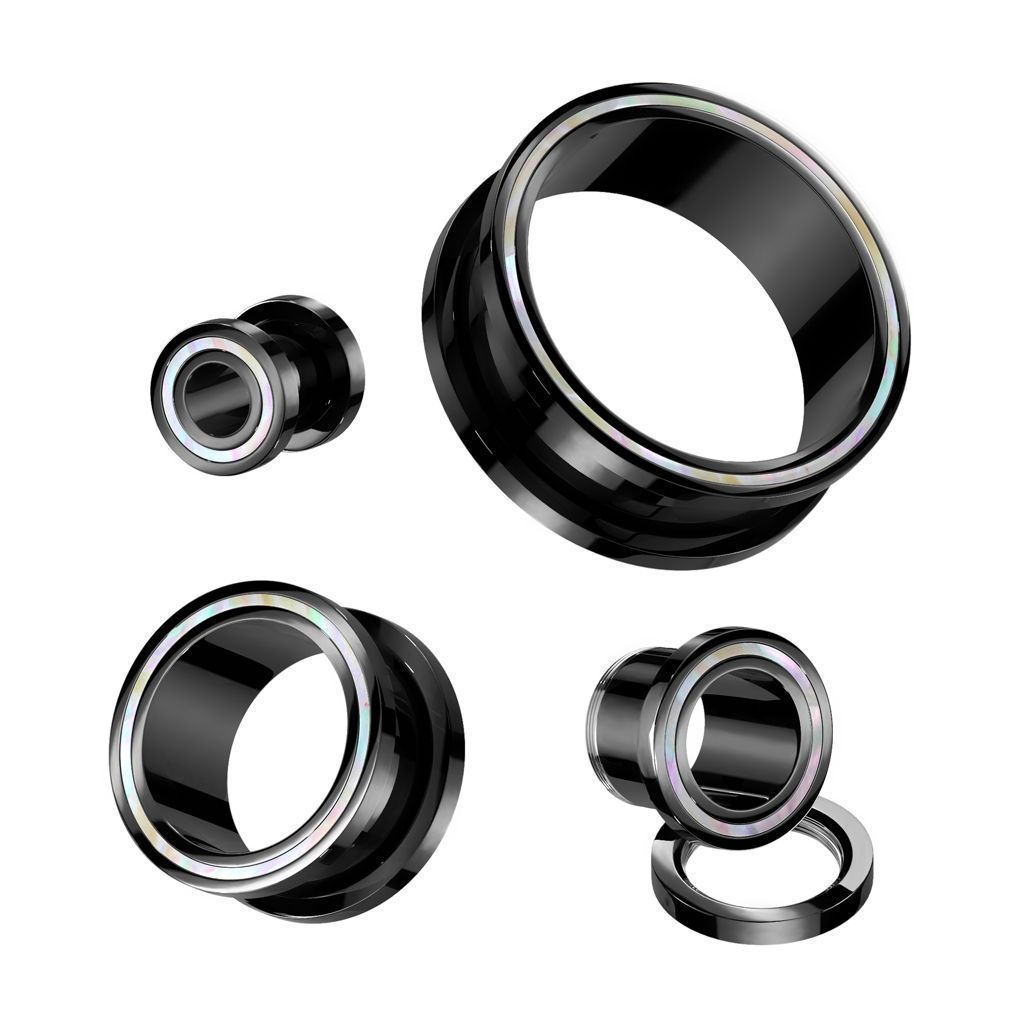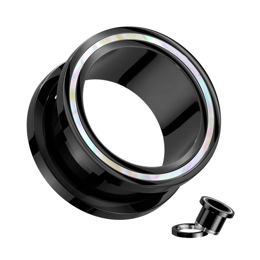 Černý šroubovací tunel do ucha s okrajem vykládaným přírodní perletí.
