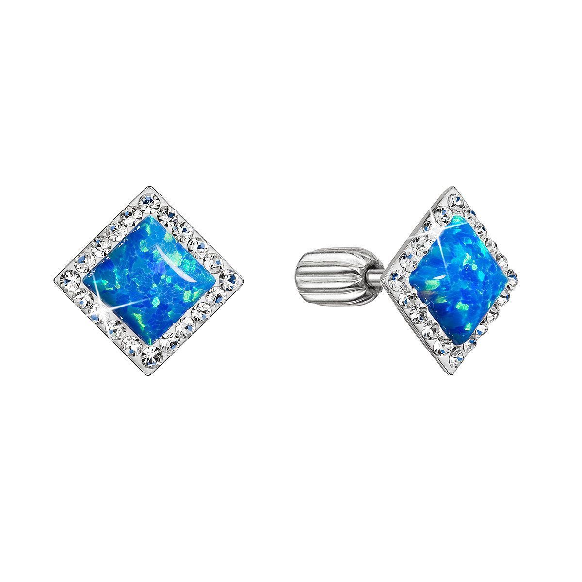 Stříbrné náušnice pecka s modrým syntetickým opálem a bílé krystaly Preciosa čtverec 31318.1 blue