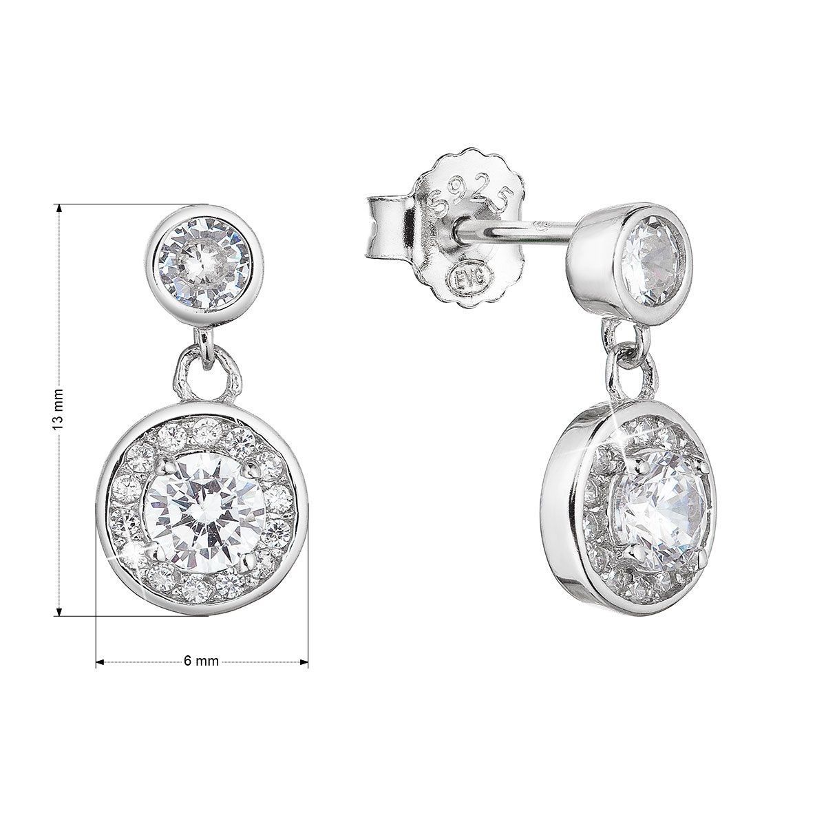 Stříbrné visací náušnice 11429.1 o ryzosti 925/1000 jsou chráněny vrstvou rhodia, která brání zčernání a žloutnutí šperku. Stříbro neobsahuje nikl, a tak si náušnice mohou bez obav vzít i dámy, které jsou náchylné k alergickým reakcím. Náušnice jsou zdobeny bílými třpytivými zirkony a zapínají se na puzetu.