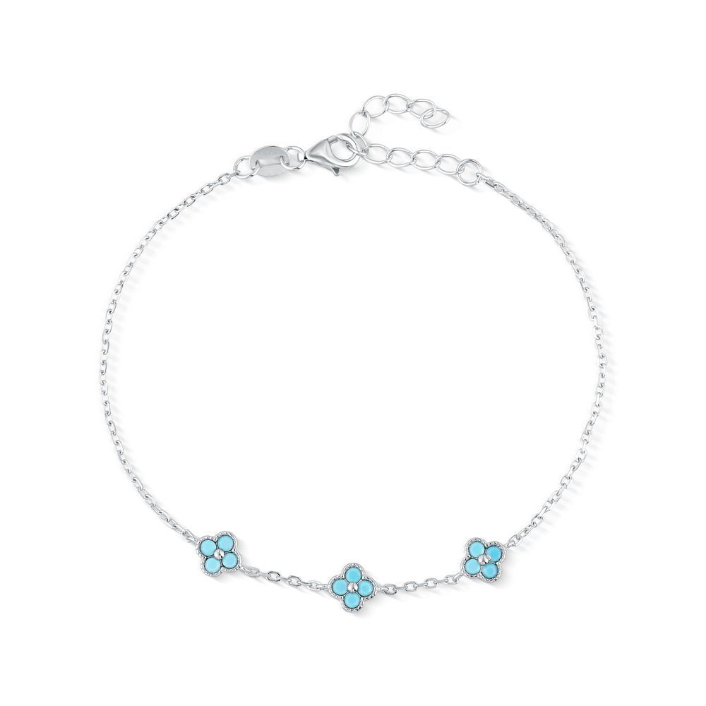 Jemný stříbrný náramek tvořený jemným očkovým řetízkem, zdobený třemi kytičkami zdobenými tyrkysovým smaltem.