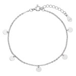 Moderní a elegantní stříbrný náramek 63003, je vyroben z řetízku po jehož obvodu jsou malé leštěné stříbrné placičky. Placičky májí průměr 5 mm a krásně se houpou na řetízku.