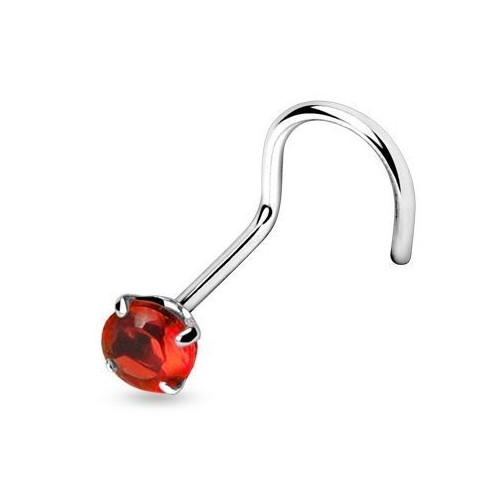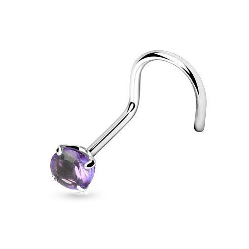 Zahnutý stříbrný piercing do nosu zdobený kulatým zirkonem.