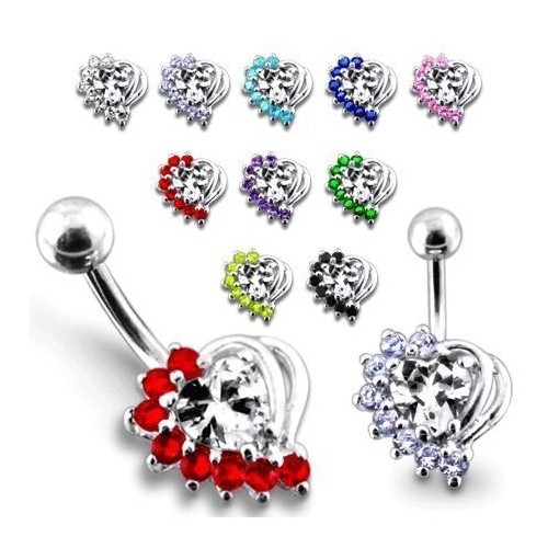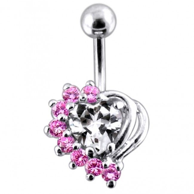 Piercingový šperk určený pro piercing pupíku. Piercing je zdobený ozdobou ve tvaru srdce.