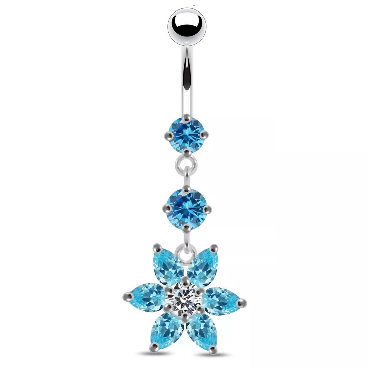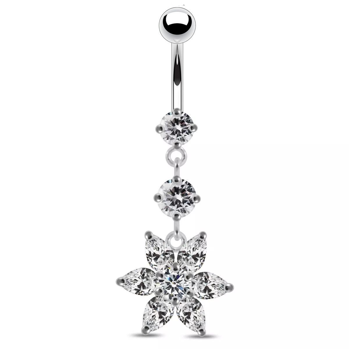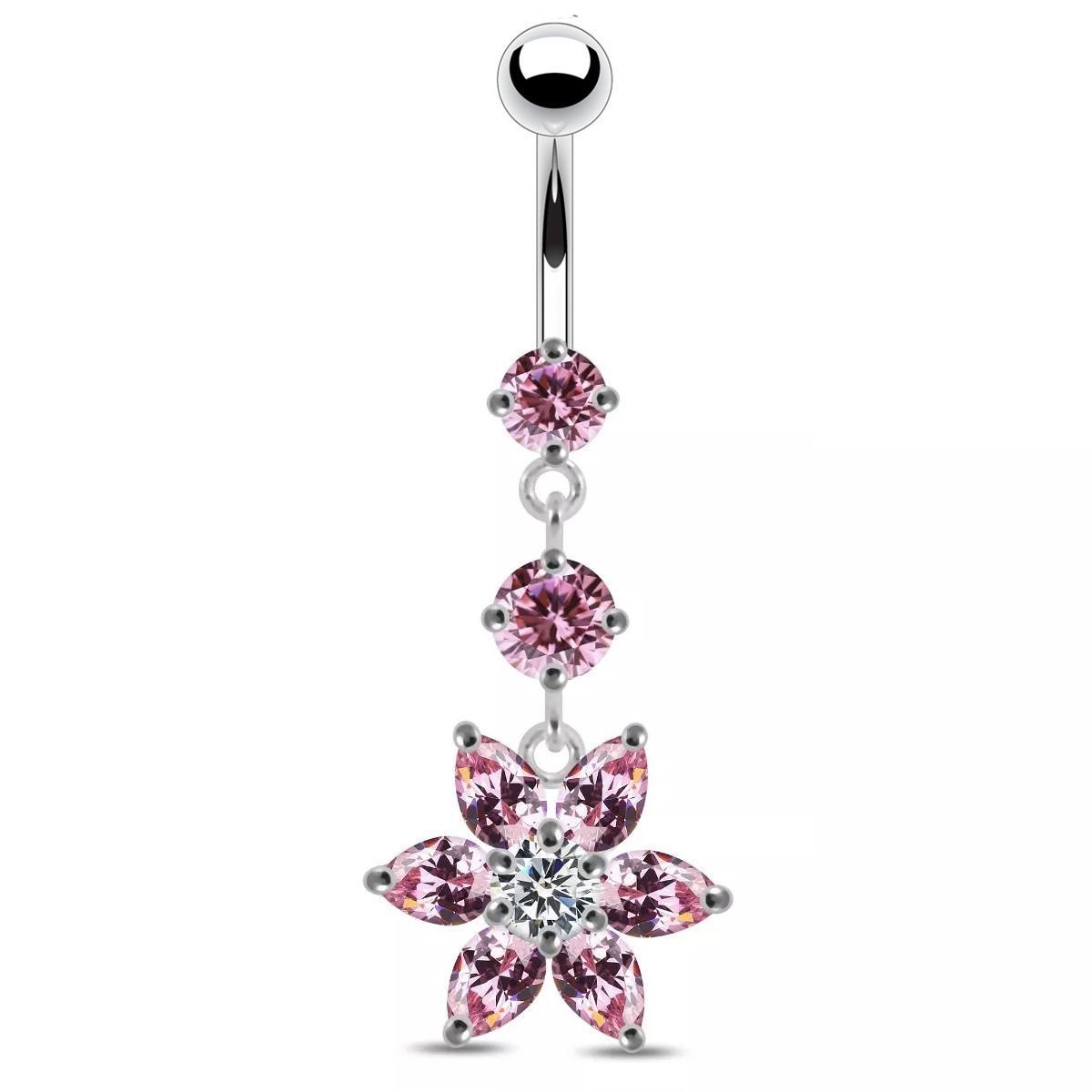 Piercingový šperk určený pro piercing pupíku. Piercing je zdobený kytičkou osazenou zirkony.