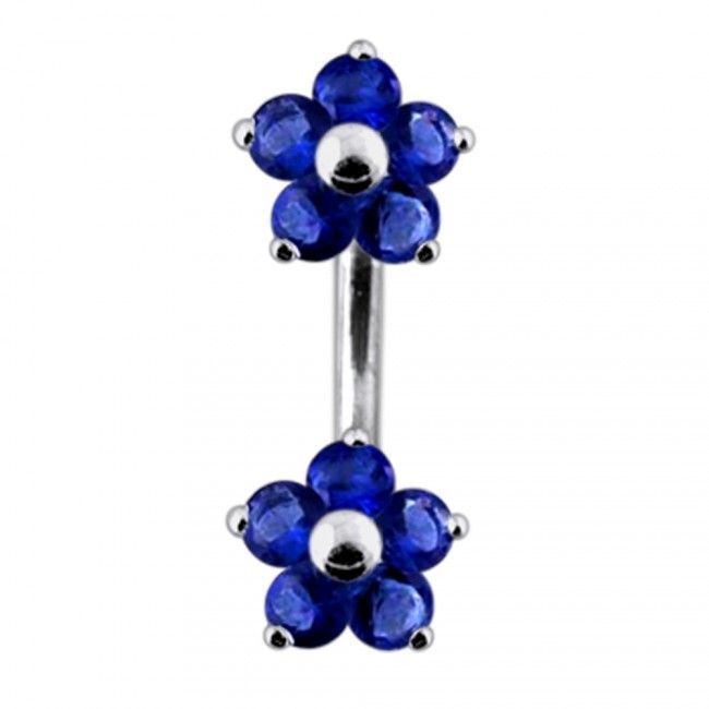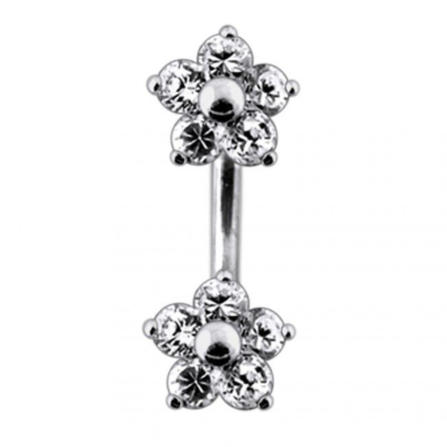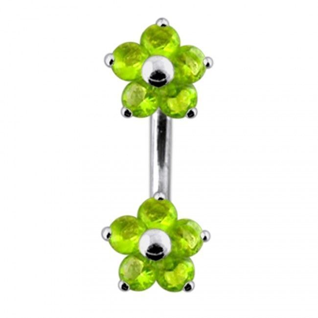 Piercingový šperk určený pro piercing pupíku. Piercing je zdobený ozdobami ve tvaru kytiček.