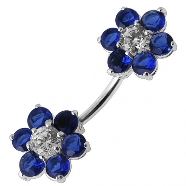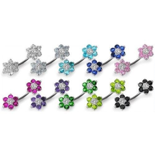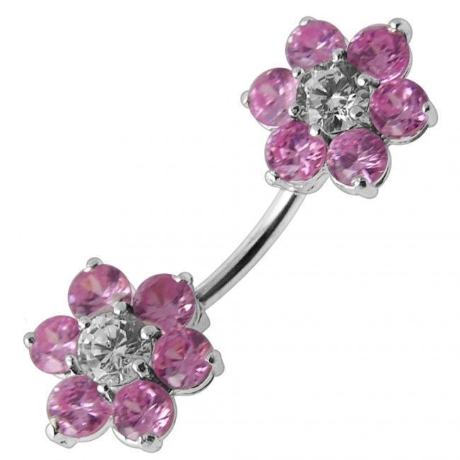 Piercingový šperk určený pro piercing pupíku. Piercing s ozdobami ve tvaru kytiček, které jsou osázené zirkony.