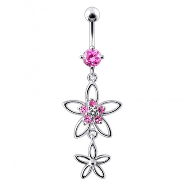 Piercingový šperk určený pro piercing pupíku. S ozdobou stříbrných kytiček zdobených zirkony.