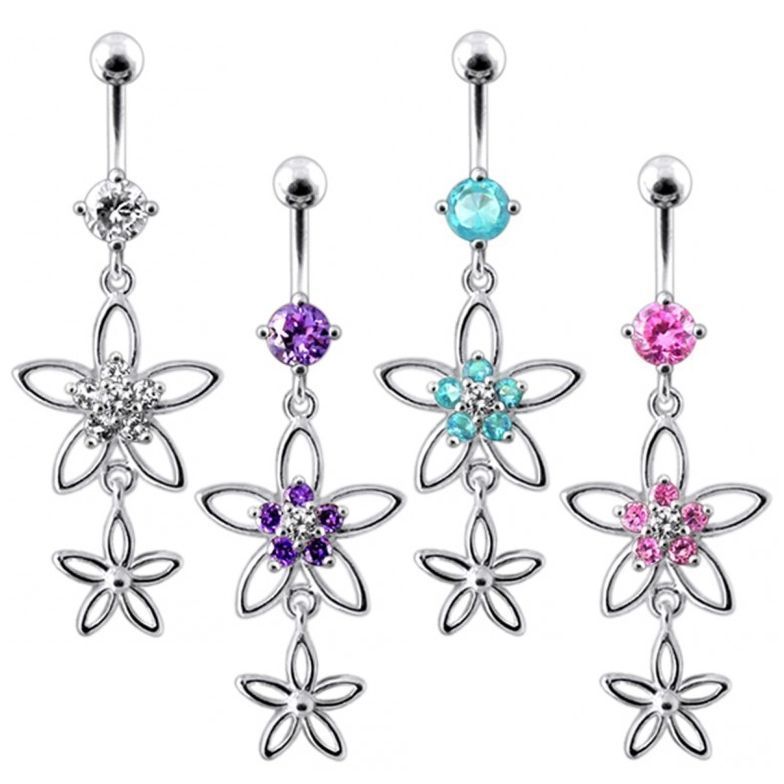 Piercingový šperk určený pro piercing pupíku. S ozdobou stříbrných kytiček zdobených zirkony.