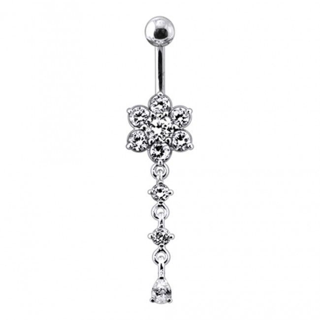Piercingový šperk určený pro piercing pupíku. Piercing je zdobený kytičkou osazenou zirkony.