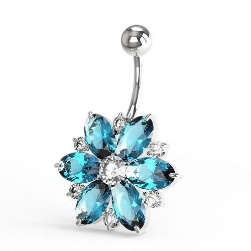Stříbrný piercing do pupíku - kytička (čirá/tyrkysová)