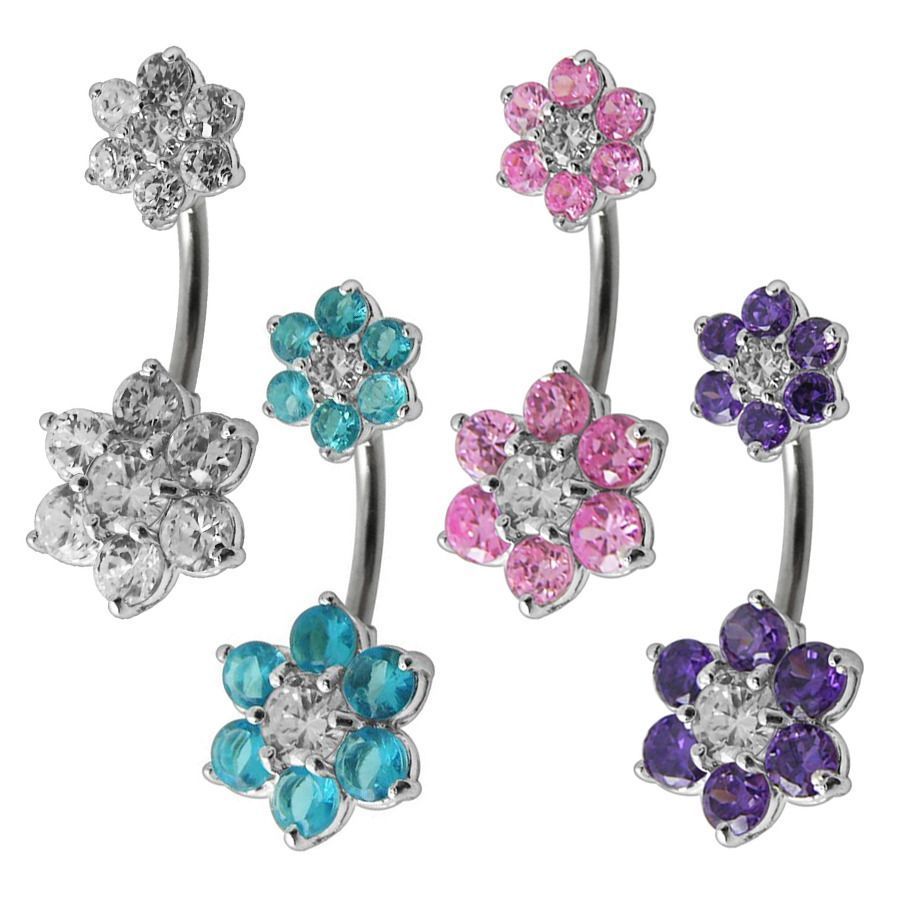 Piercingový šperk určený pro piercing pupíku. Piercing s květy zdobenými zirkony.