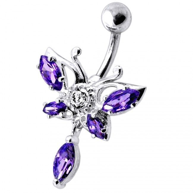 Piercingový šperk určený pro piercing pupíku. Piercing je zdobený ozdobou motýla osázenou zirkony.
