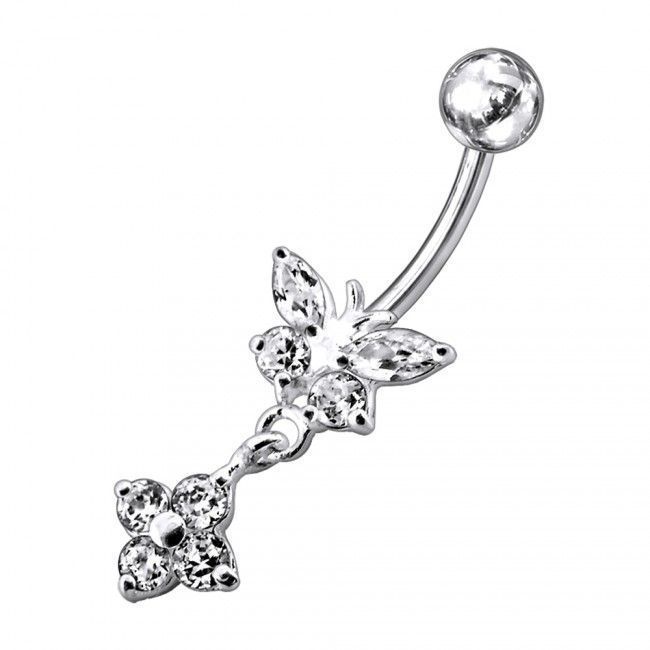 Ocelové šperky a piercing (19918) > Piercing (3904) > Piercing do pupíku (1004) > ocel 316L a stříbro 925 (92) > Stříbrný piercing do pupíku - motýlek s kytičkou (čirá)