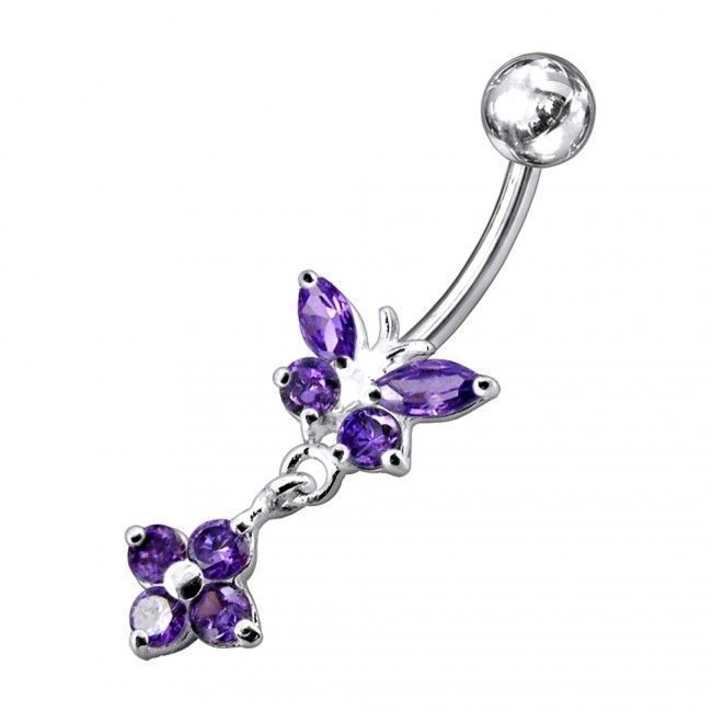 Piercingový šperk určený pro piercing pupíku. Piercing s motýlkem a kytičkou zdobenými zirkony.