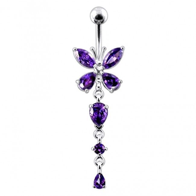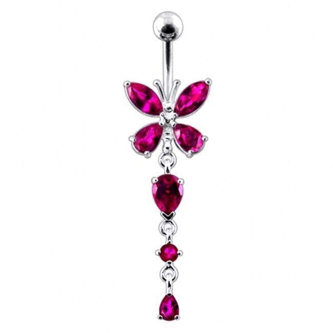 Piercingový šperk určený pro piercing pupíku. Piercing je zdobený visací ozdobou - motýlkem se zirkony.