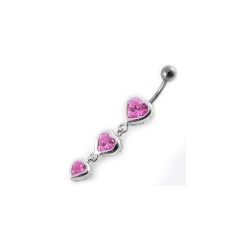 Piercingový šperk určený pro piercing pupíku. Piercing s dlouhou ozdobou se srdíčky se zirkony.