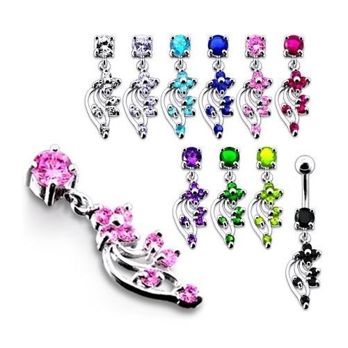 Piercingový šperk určený pro piercing pupíku. Piercing je zdobený kytičkou osazenou zirkony.