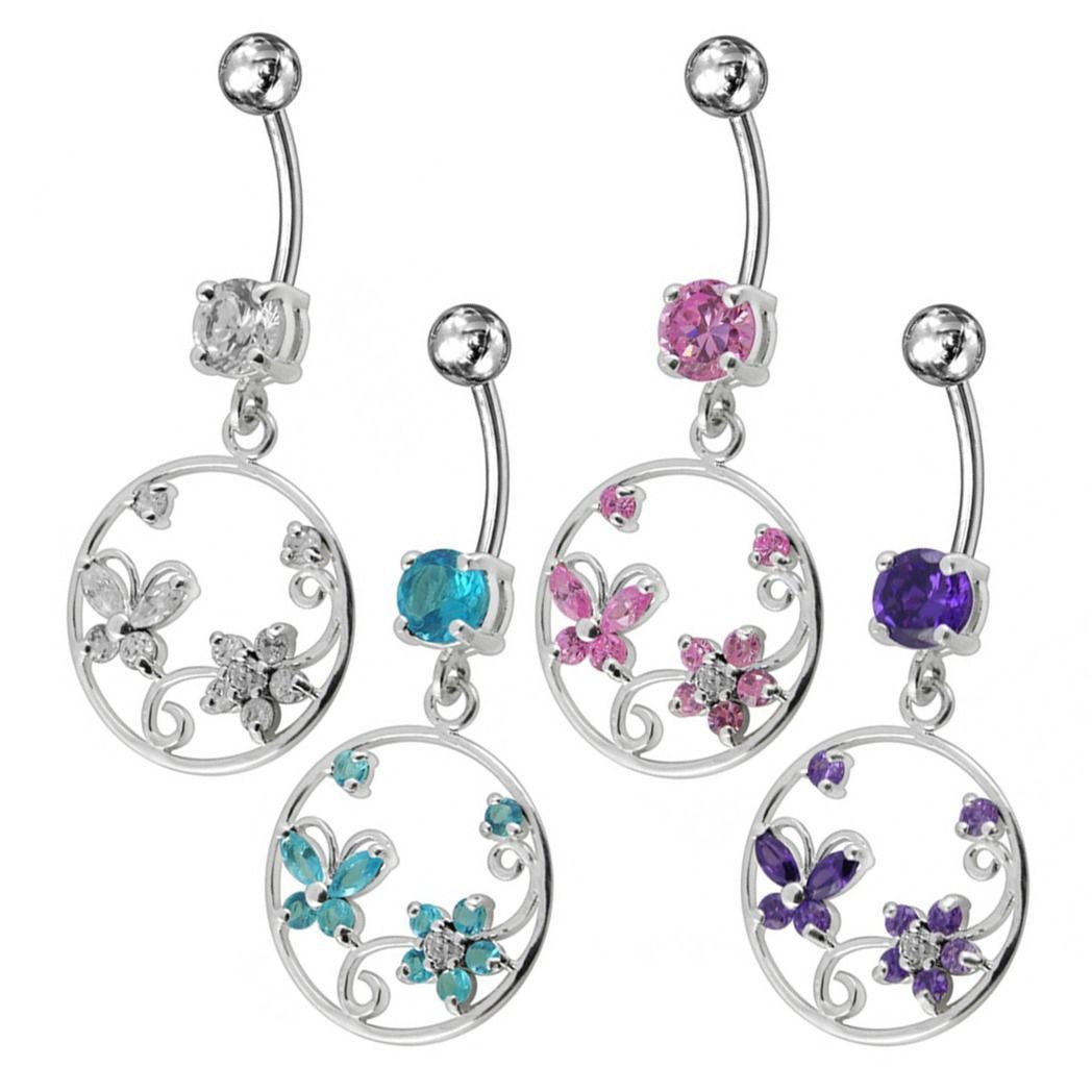 Piercingový šperk určený pro piercing pupíku. Piercing s ozdobou s kytičkami zdobenými zirkony.