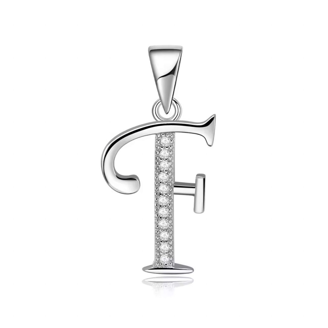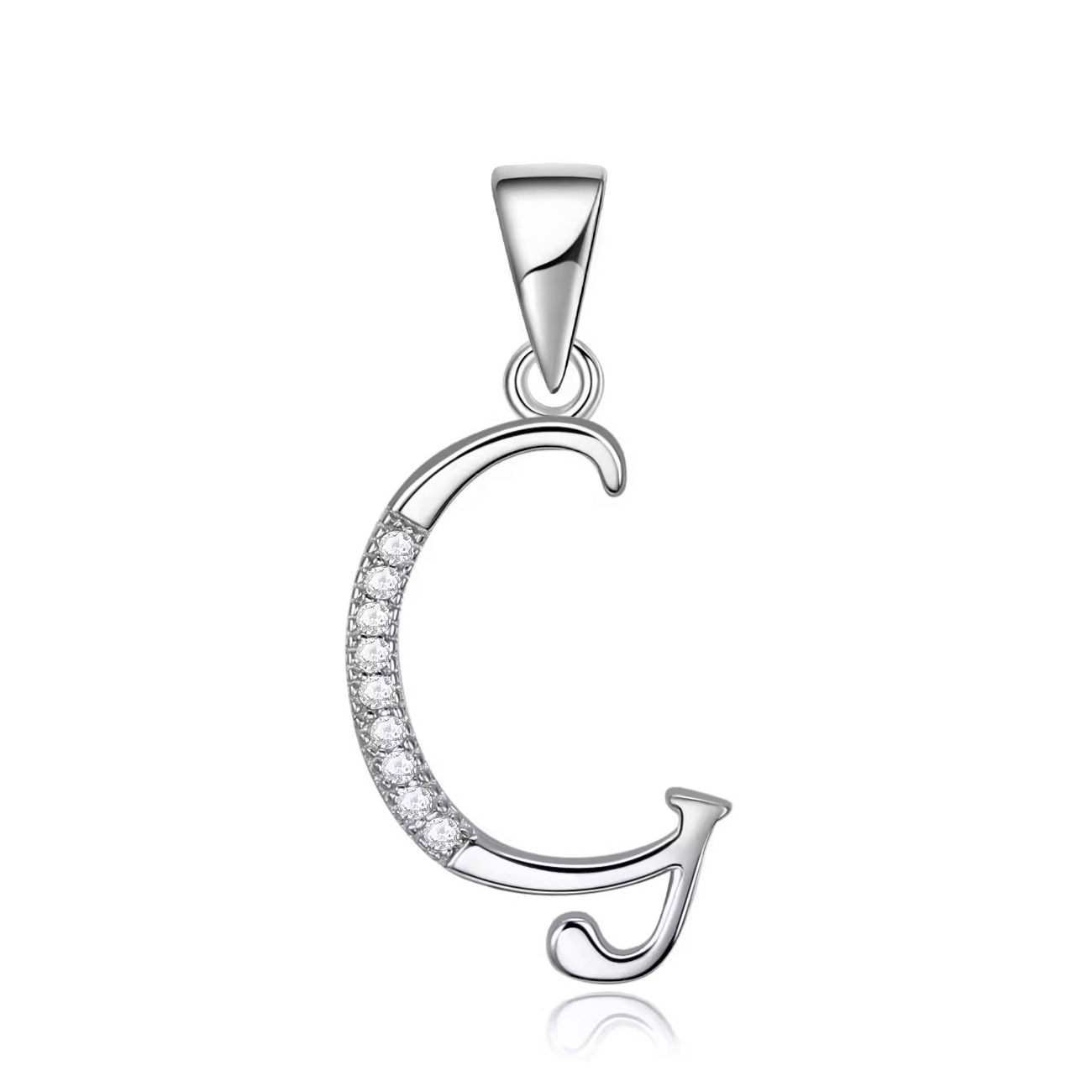 Stříbrný přívěsek ve tvaru iniciály, písmenka. Písmeno je zdobeno čirými zirkony.