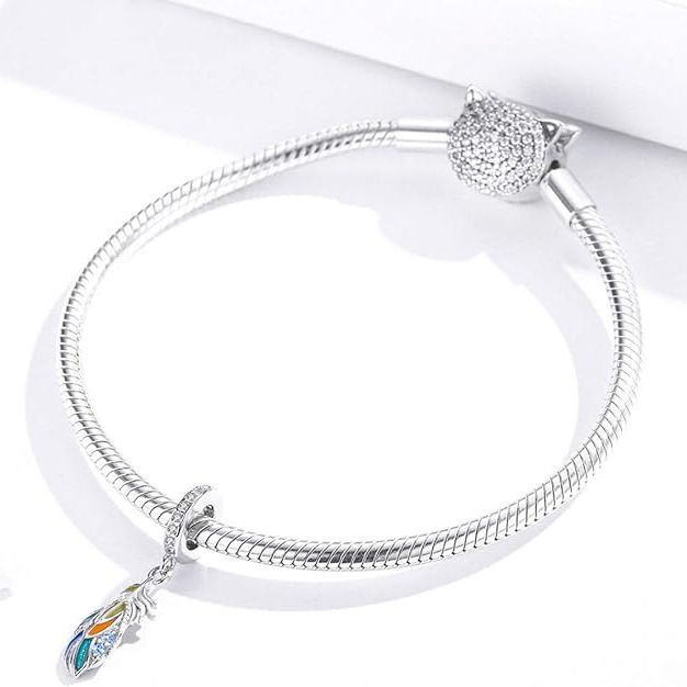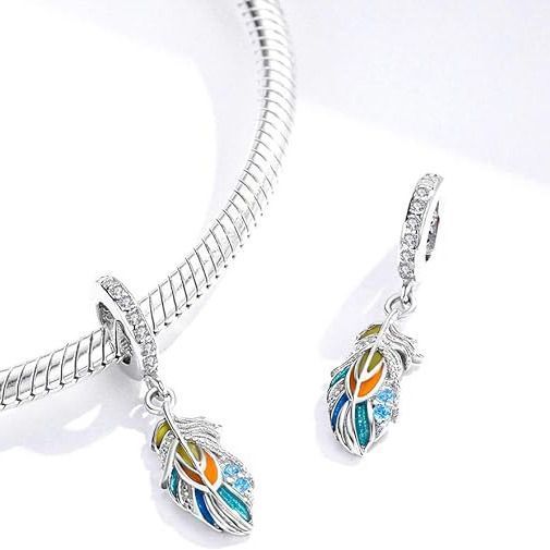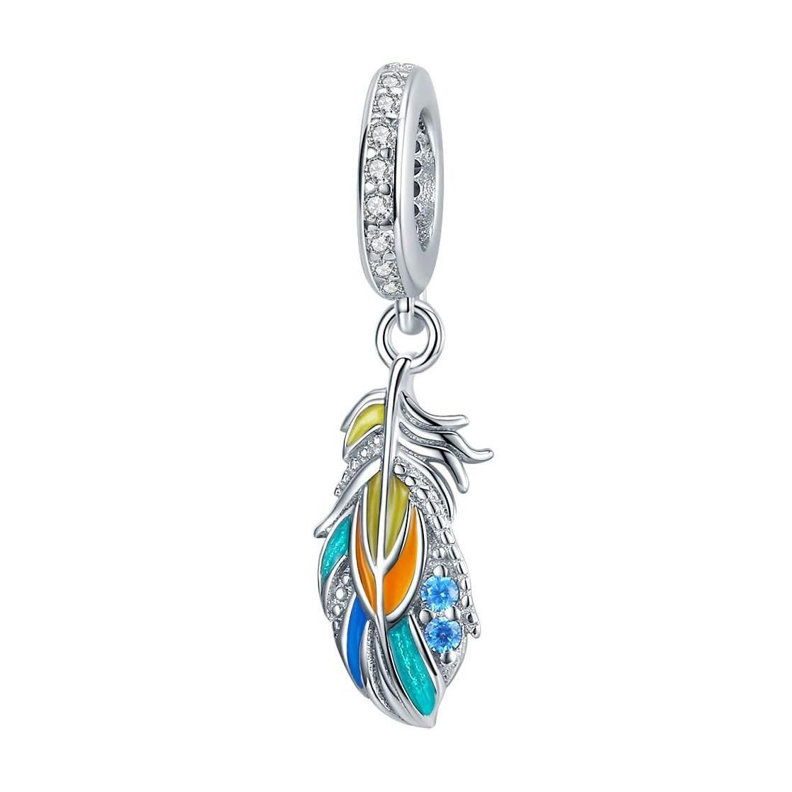 Stříbrný přívěšek korálek na náramek s přívěškem ve tvaru peříčka zdobeného modrými zirkony