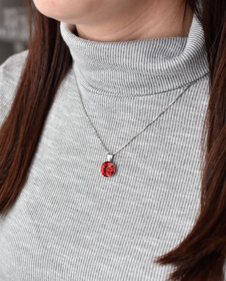Červený Swarovski krystal má průměr 12 mm. Na přívěšek bylo použito stříbro ryzosti 925/1000, jehož povrch prošel úpravou rhodiem. Rhodium šperk ochrání proti zčernání, zežloutnutí nebo poškrábání.