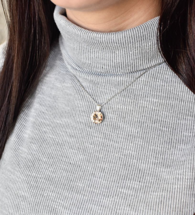 Hnědý Swarovski krystal má průměr 12 mm. Na přívěšek bylo použito stříbro ryzosti 925/1000, jehož povrch prošel úpravou rhodiem. Rhodium šperk ochrání proti zčernání, zežloutnutí nebo poškrábání.