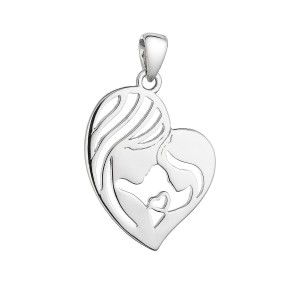 Stříbrný přívěsek dvojité srdce uprostřed doplněné matkou a dítětem. Přívěsek je zdobený zirkony čiré barvy.