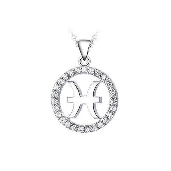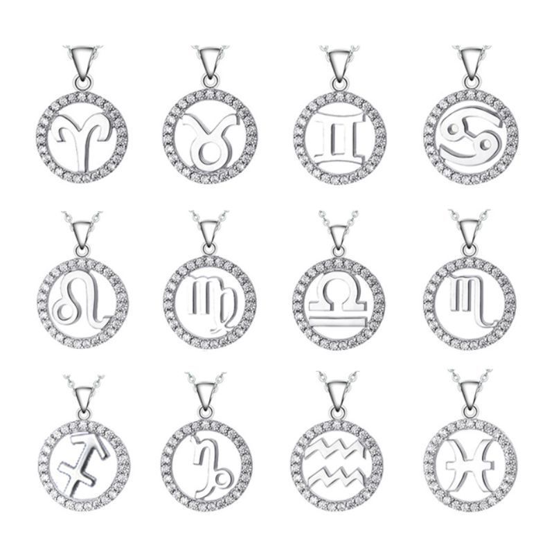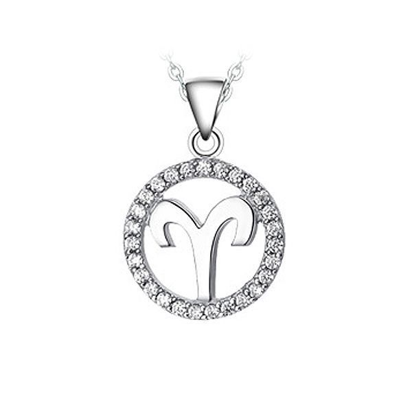 Stříbrný přívěsek ve tvaru znamení horoskopu. Přívěsek je osazený čirými zirkony.