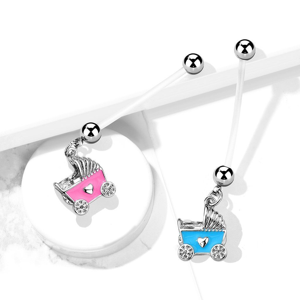 Piercingový šperk určený pro piercing pupíku. S ozdobou kočárku z kvalitní bižuterie. Vhodný pro těhotné ženy. S extra dlouhou ohebnou tyčkou.