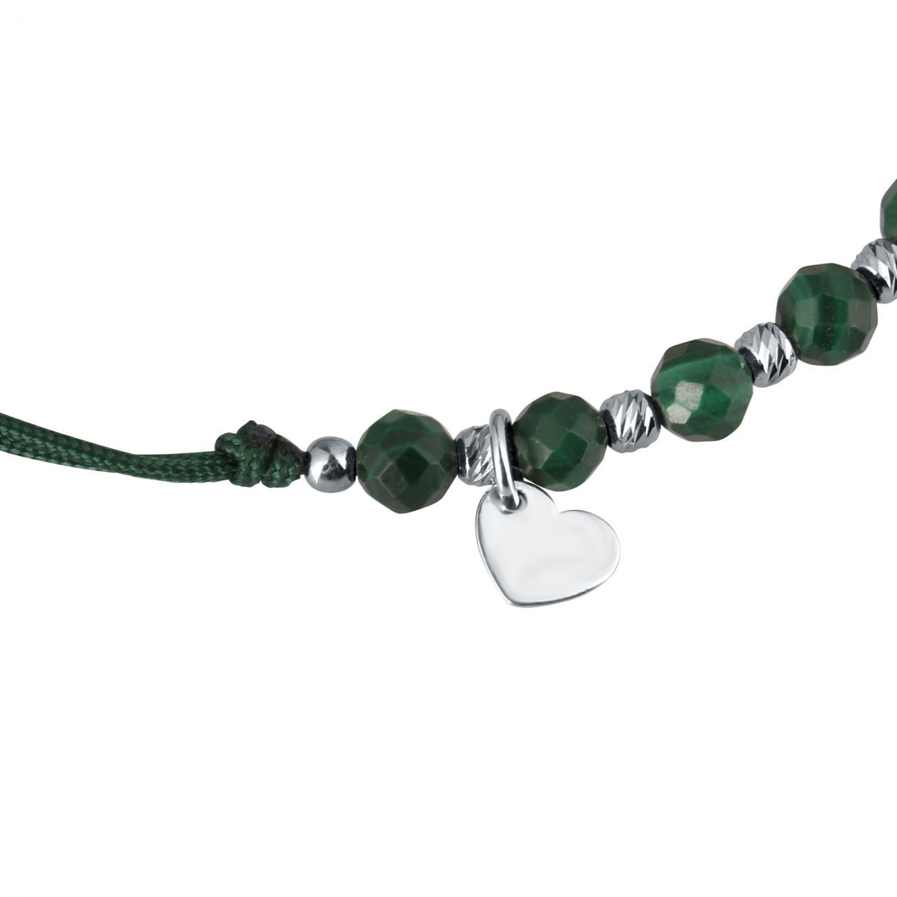 Je vyroben z hladké pevné šňůrky a korálků z malachitu, které se střídají se stříbrnými kuličkami, navíc je přizdoben přívěskem tvaru srdíčka.