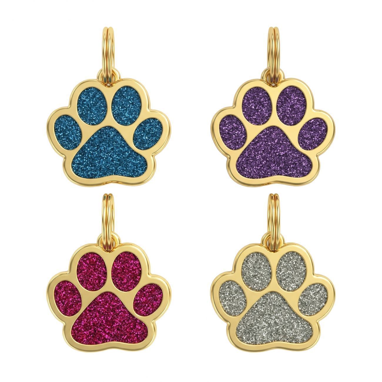 Třpytivá psí známka ve tvaru tlapky se zlatým okrajem je doplněk, který okamžitě zaujme na slunci se nádherně třpytí a dodá vašemu pejskovi styl, který jen tak někdo nemá.
