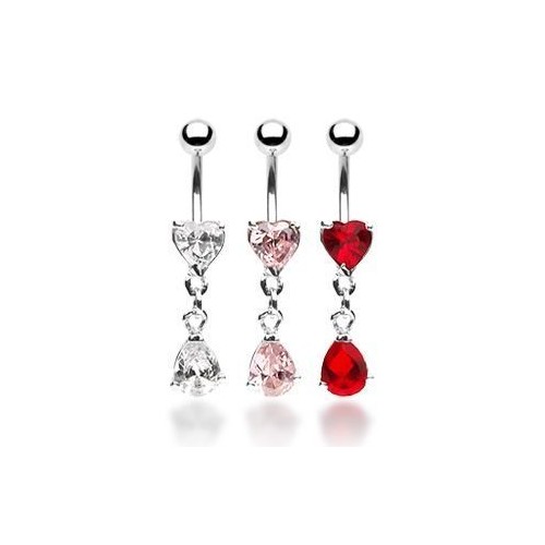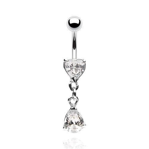 Piercingový šperk určený pro piercing pupíku. S ozdobou srdce a kapky z kvalitní bižuterie.