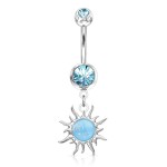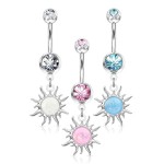 Piercingový šperk určený pro piercing pupíku. Piercing do pupíku zdobený visací ozdobou ve tvaru slunce.