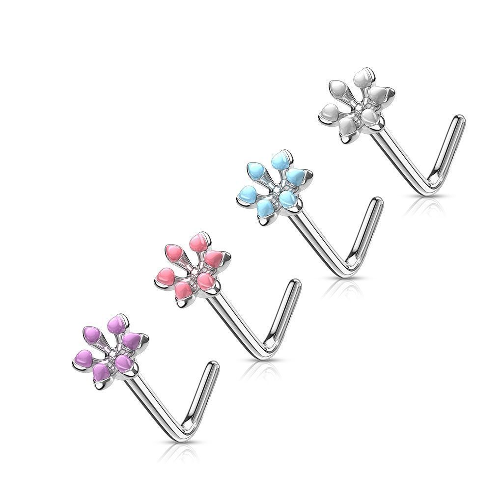 Piercing nosovka - piercing do nosu. Zahnutý piercing do nosu s ozdobou ve tvaru kytičky. Kytička je zdobena smaltem.