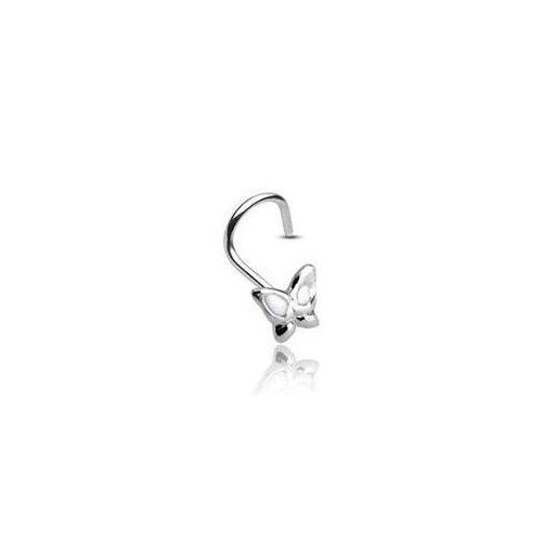 Zahnutý stříbrný piercing do nosu zdobený motýlkem.
