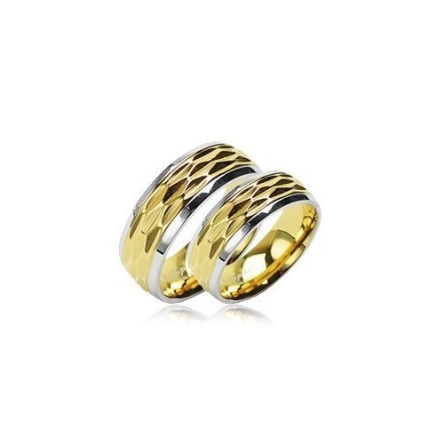 Snubní prsteny z lesklé chirurgické oceli. Se zlacenou ozdobnou proužkou a jemnými drážkami.
