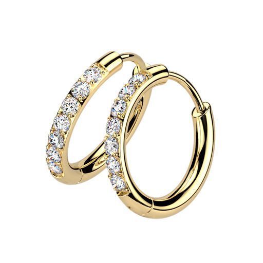 Zlacené titanové náušnice kroužky osázené čirými moissanity. Používáme pouze kameny barvy D - nejvyšší stupeň barvy - nabízející ohromující, bezbarvý třpyt, který se velmi podobá diamantům nejvyšší kvality. Každý kámen má čistotu VVS, což znamená, že je prakticky bezchybný.