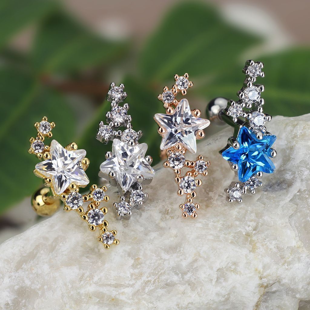 Cartilage piercing do ucha s ozdobou se zirkony ve tvaru hvězdiček.