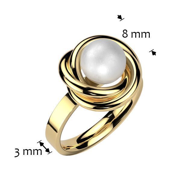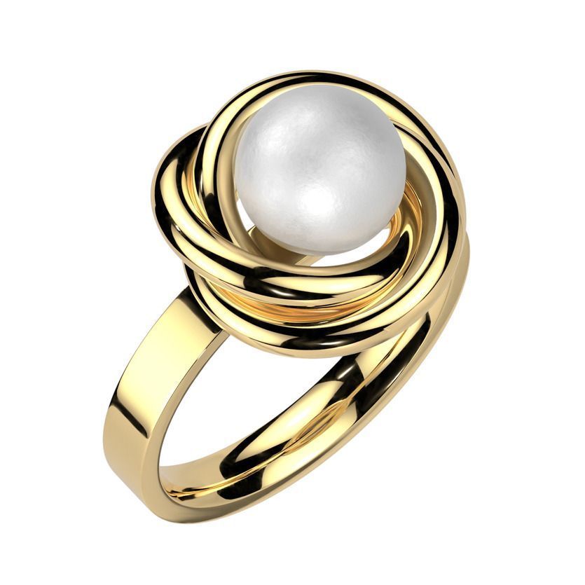 Zlacený ocelový prsten, jehož střed je zdobený syntetickou perlou bílé barvy. Prsten má lesklý povrch a je v barvě žlutého zlata.