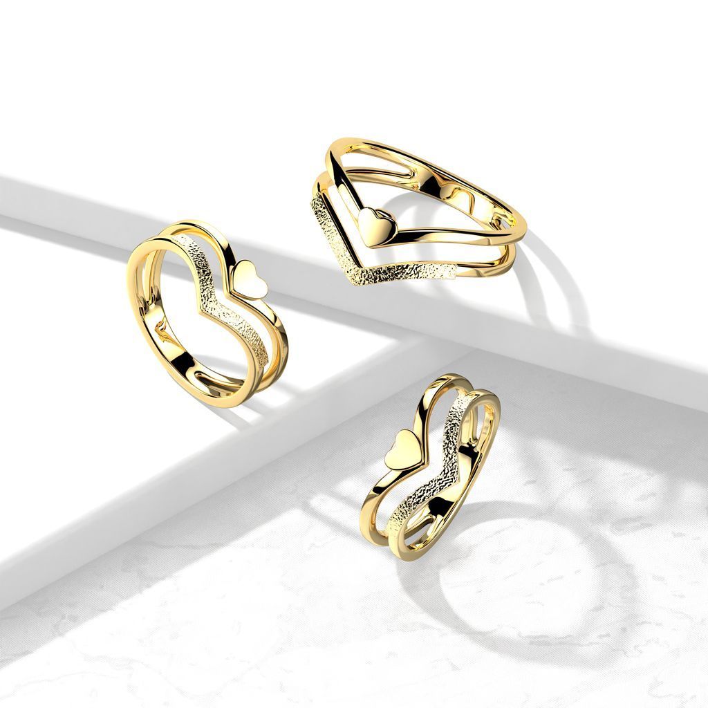 Zlacený ocelový prsten s kombinovaným povrchem - lesklým a pískovaným. Zdobený srdíčkem.